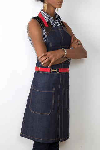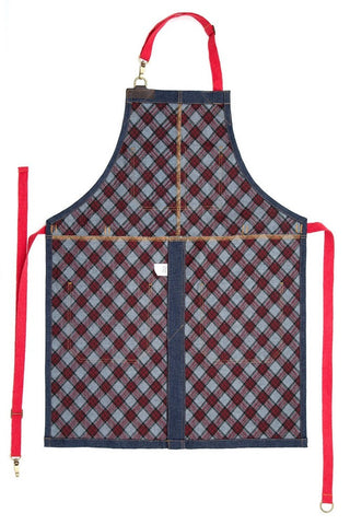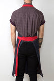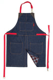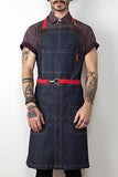 Blue Denim & Brown Leather Barber Apron – Premium No-Tie Adjustable Split-Leg Apron with Genuine Leather Patches, Brass Hardware & 10oz Twill Fabric