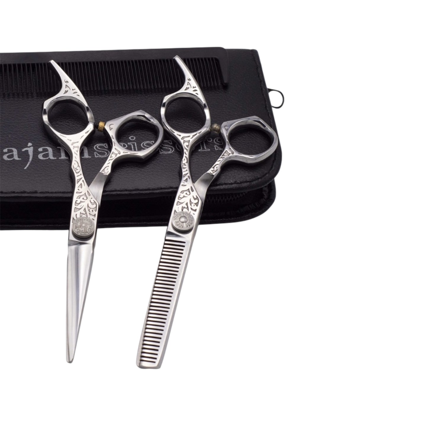 Make every cut a statement with the Tajam Ornix Precision Grooming Set—a uniquely crafted collection of hair tools that blend elegance with exactness. Designed with ornate metal handles and precision-forged blades, this 5-piece set empowers stylists and grooming artists with tools as refined as their work. Whether you’re perfecting a fade or sculpting a style, the TajamOrnix set delivers on control, sharpness, and show stopping design.